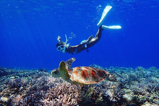 | ウミガメの遭遇率が高いことで有名! 干潮時は少し泳ぎにくくなるので、満潮前後の時間帯がベストです。 自分のペースでのんびりシュノーケリングしたい人におすすめです。 |